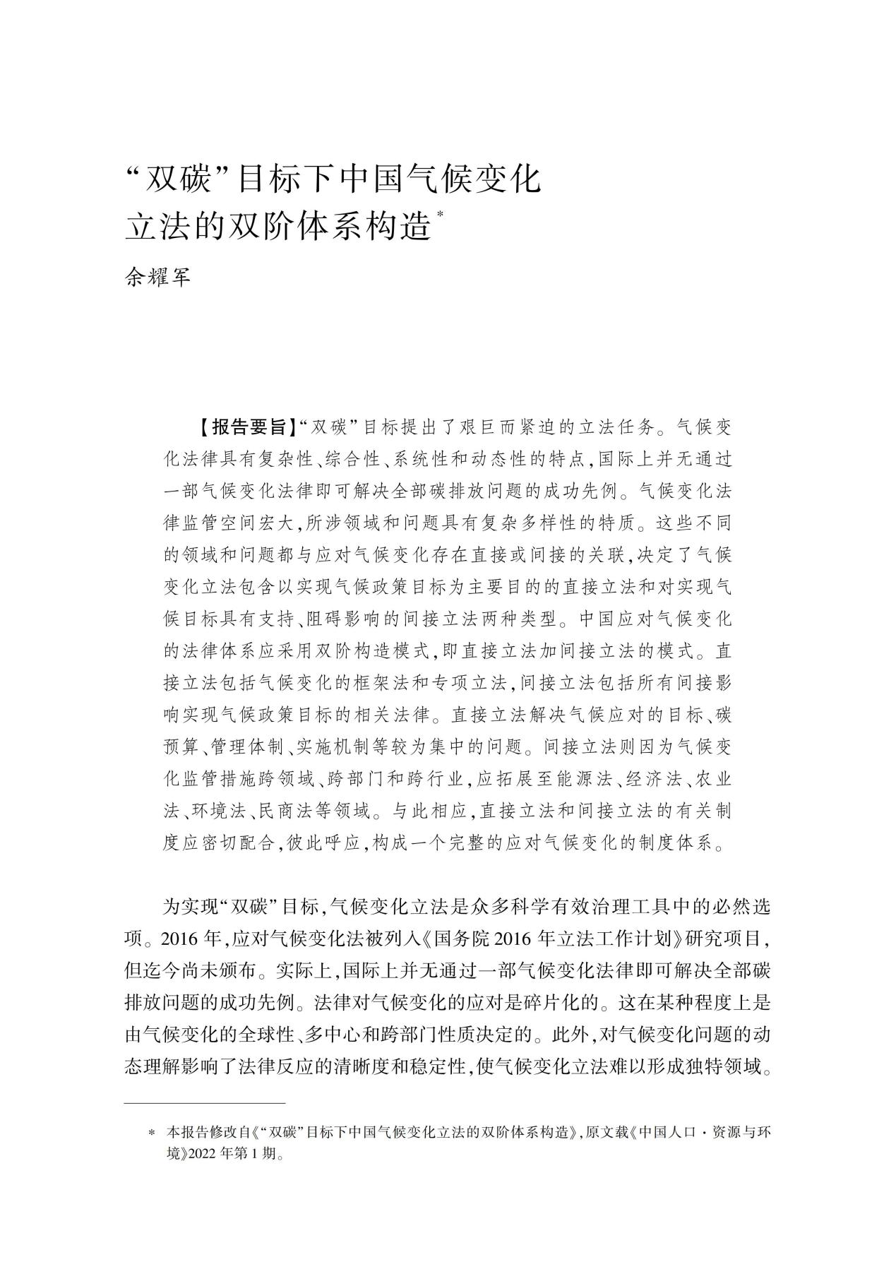 余耀军:“双碳”目标下中国气候变化立法的双阶体系构造