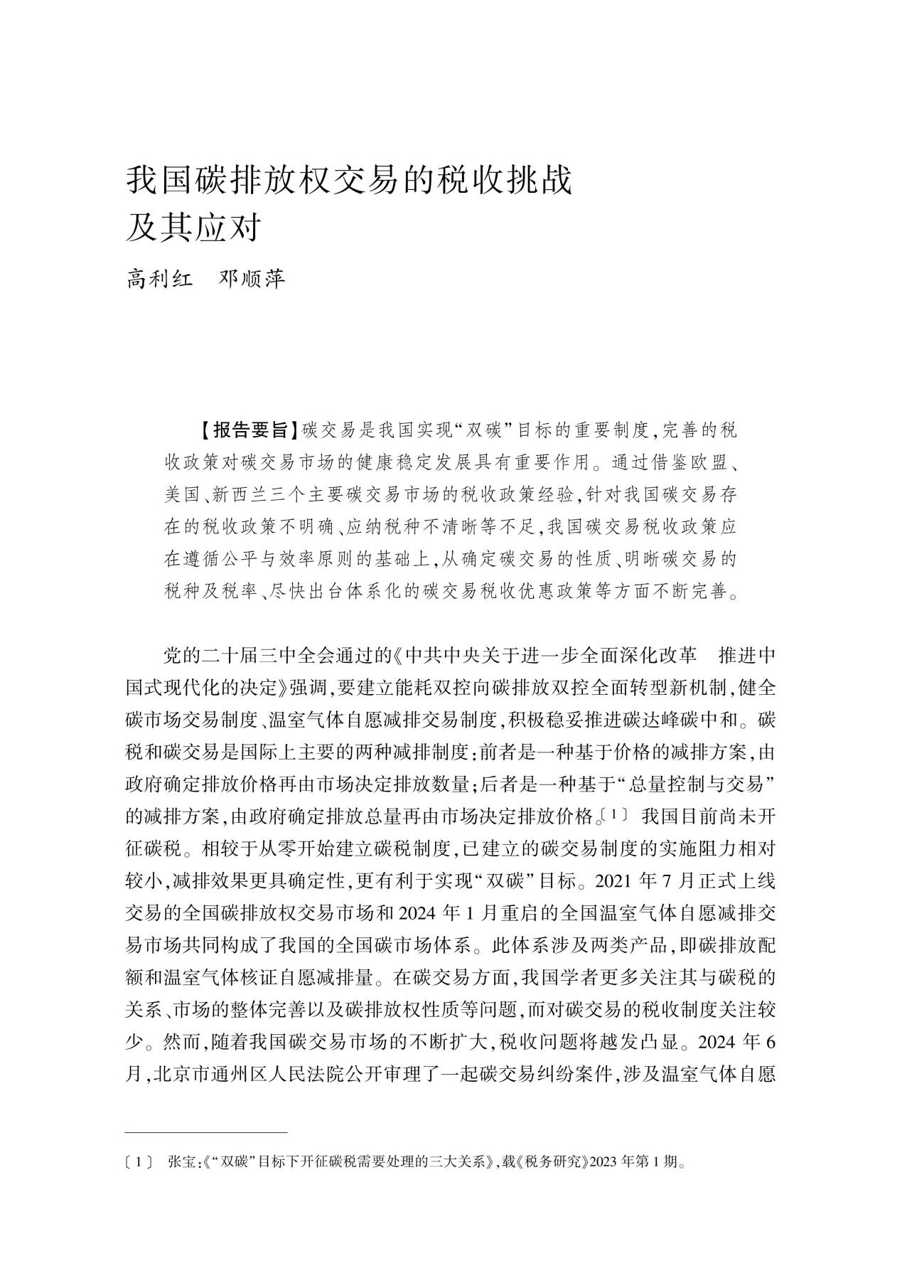 高利红,邓顺萍:我国碳排放权交易的税收挑战及其应对